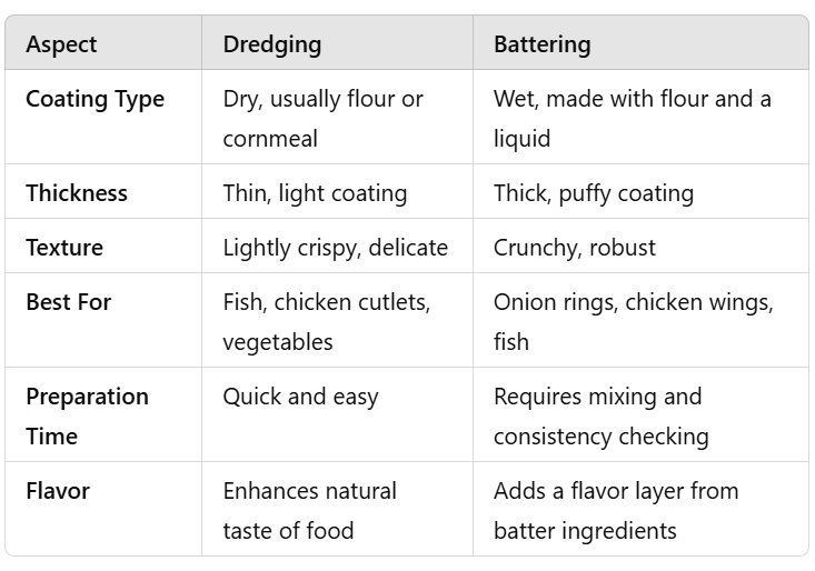 Dredging creates a thin, golden layer that’s lightly crisp and allows the flavor of the food to shine through. The coating has a delicate crunch and a subtle flavor, making it a perfect choice when you want a lighter finish.
