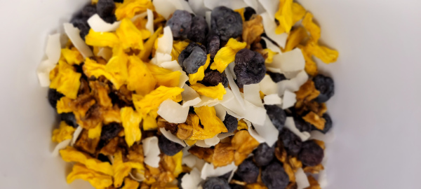 A tropical treat, B + B Bliss blends honey-glazed bananas, blueberries, pineapple, ginger, and coconut for a sweet, refreshing flavor. Ideal for smoothies, yogurt, or as a topping for oatmeal, this blend captures the essence of summer with each bite.